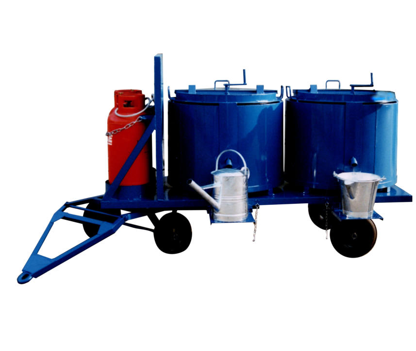 A Standard bitumen boiler mounted on a flat top truck fitted with specialist heatshield to protect the LPG cylinder, and a bucket step to the rear. Designed to move the bitumen boiler around a site, never on a road. The Bitumen boiler itself has a half-hinged lid, with an immersed outlet tap to decant the materials. (below, a twin unit) designed for site use only.
